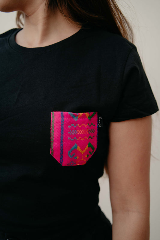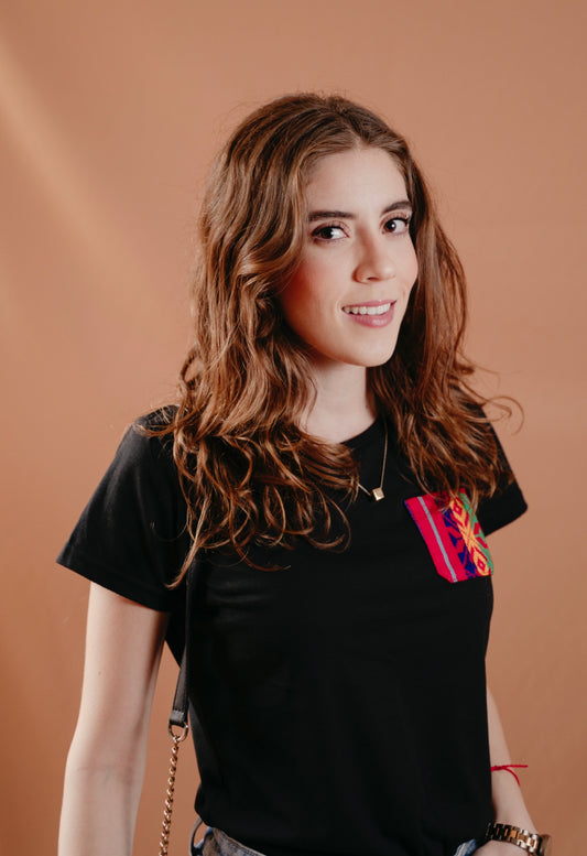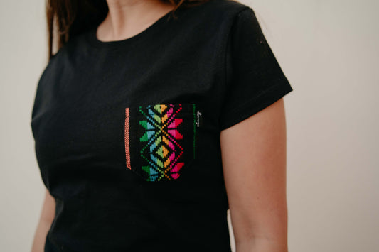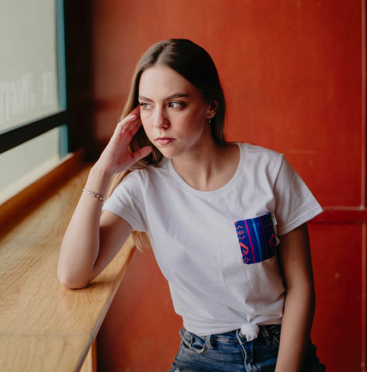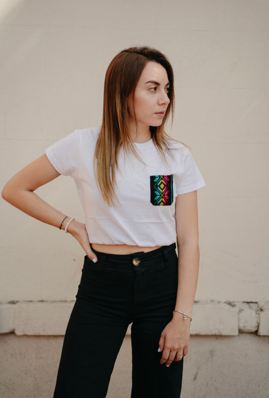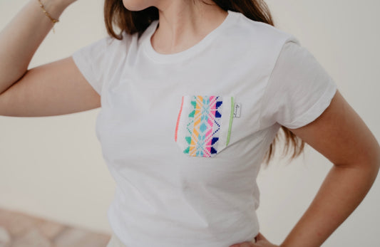 Playera Dama blanca con bolsillo blanco/arcoíris